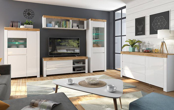Nábytek této kolekce je vhodný pro vybavení moderního a jednoduchého stylu obývacího pokoje. Kombinace barev bílá/dub wotan/bílý lesk bude působit v pokoji moderním a čistým dojmem. Skvělé otevírání je zajištěno značkovými závěsy, které zaručují tiché otevírání dvířek.