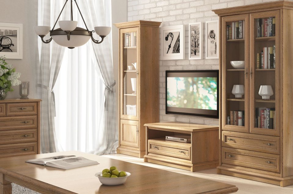 Bohaté zdobení v podobě vyřezávaných lišt, soklů a dvířek, jemné kovové úchytky, fazetované hrany skel vitrín, to vše dodává sérii až historický nádech. V sérii najdete 33 modulů v barevném provedení: kaštan a dub amsterdam.