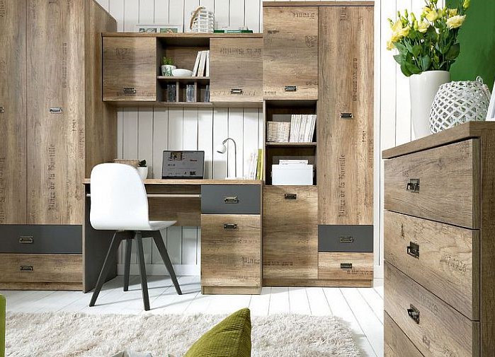 s promyšleným designem se opírá o nejnovější trendy v zařizování pokojů pro děti a studenty. Vyznačuje se velmi originálním a moderním provedením dvířek a korpusů s výraznými grafickými akcenty. 5 dílů v barevném provedení: korpus Dub canyon monument, Šedý wolfram / dvířka Dub canyon monument s 3D potiskem, Šedý wolfram.